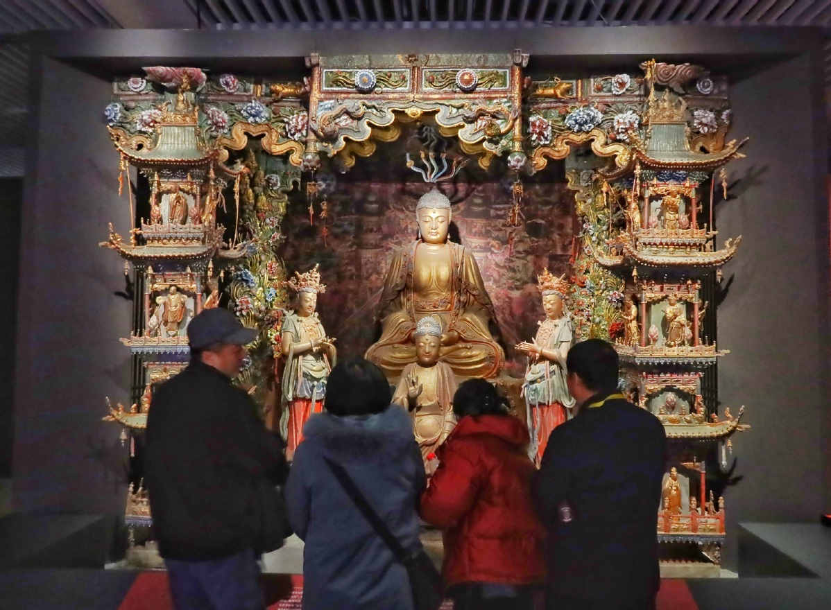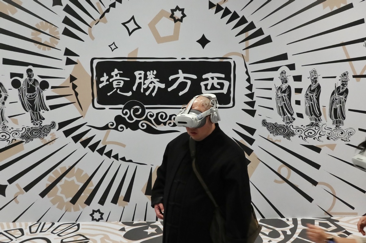 12月22日,观众通过VR眼镜感受数字化小西天悬塑。中国日报记者 姜东 摄