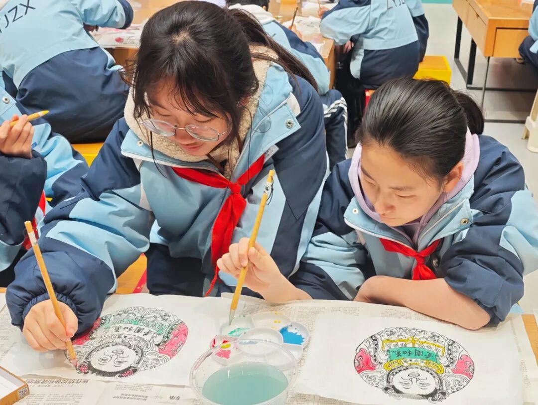 同学们认真学习印制年画的方法,在志愿者的协助下,开启了“一团和气”木版年画的制作之旅。大家先将宣纸平整铺在涂好墨汁的木刻印板上,用马莲轻轻按压,使图案清晰印在纸上。然后根据自己的喜好,在印好的图案内用颜料填色,鼓励创新配色,同时保留传统韵味,用自己的作品展现“年的味道”。