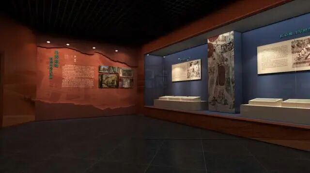 本次展览在空间布局与展陈设计上颇具巧思,以藏蓝、赤色、酱色、沙黄为核心主色调,还原敦煌戈壁与石窟的自然肌理与人文质感,整体风格兼具历史厚重感与视觉感染力。
