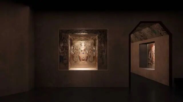展厅采用嵌入式弧形墙体结构,模拟岩壁的天然肌理,呈现砂岩质感,指尖拂过时仿若触碰历史的褶皱。展厅垂挂幔帐轻纱,以柔化空间轮廓的方式,营造出“洞中观画”的私密感。同时展厅采用低照度灯光营造出静谧肃穆的观展氛围,让观众行走时可感知敦煌艺术的肌理,增强“身临其境”的真实感。