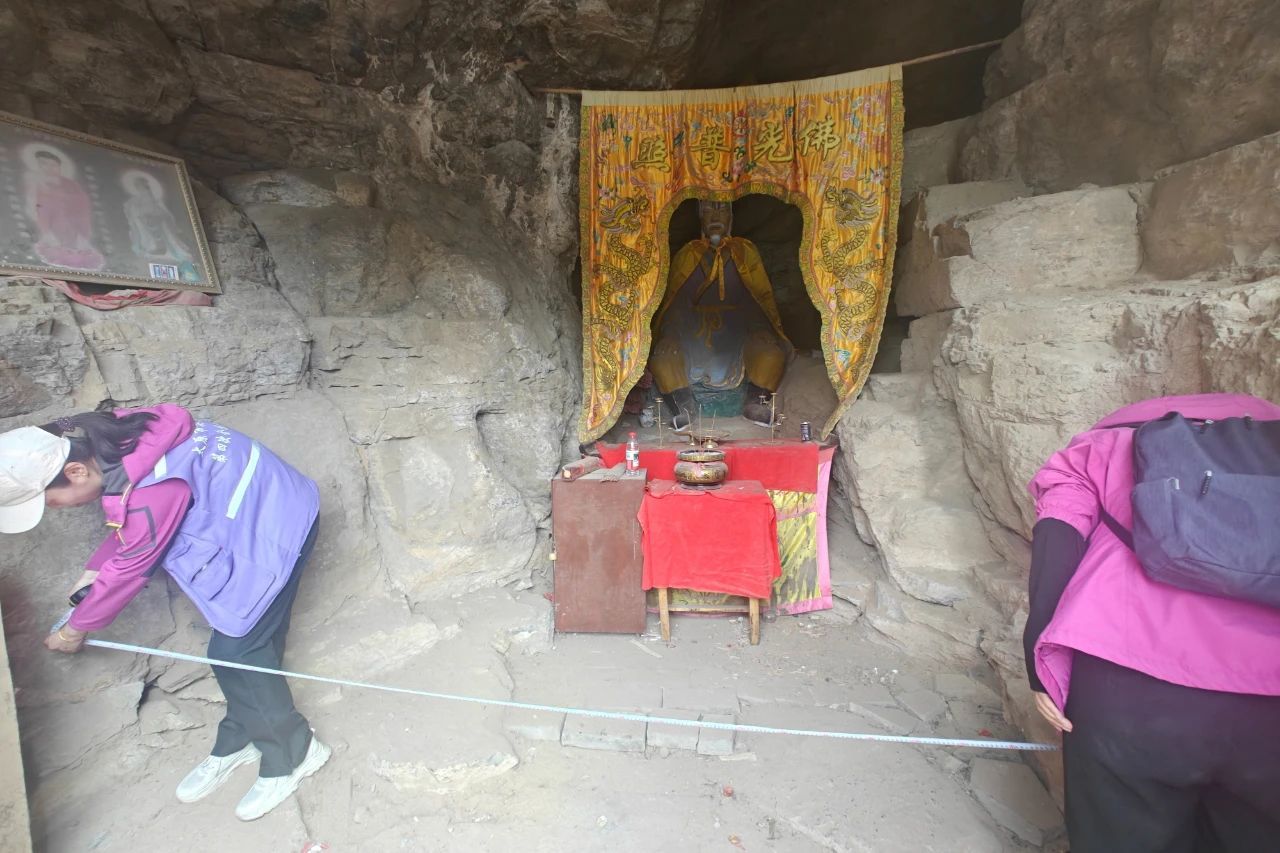 联合工作组经1个多小时的车程与徒步攀爬,抵达海拔700多米的山崖石窟——“王山爷阁”,这是尖草坪区“四普”实地调查中首次新发现石窟寺类型文物,该处新发现文物呈坐北朝南布局,现存窟龛1处,窟内面积约10余平方米,纵向有三层山崖,残存明清时期壁画题记遗存。队员们利用无人机、高清相机、测距仪等专业设备,开展了细致的现场测绘、图像采集等工作,收集详细的数据信息。