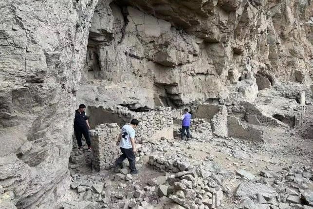 “古聚落遗址”位于小塔村一处山崖的半山腰,遗存石头砌筑的墙体、门洞,20余间房屋隔断以及灶、炕等人类居住的遗迹。据村民讲述,当地人称这里为“固”,是小塔村先民的早期居所,兼具居住和躲避战乱的双重功能。普查队通过仔细勘察,在地表采集到不同时期的陶、瓷片及铁锅残片若干,为进一步断代收集实物依据。