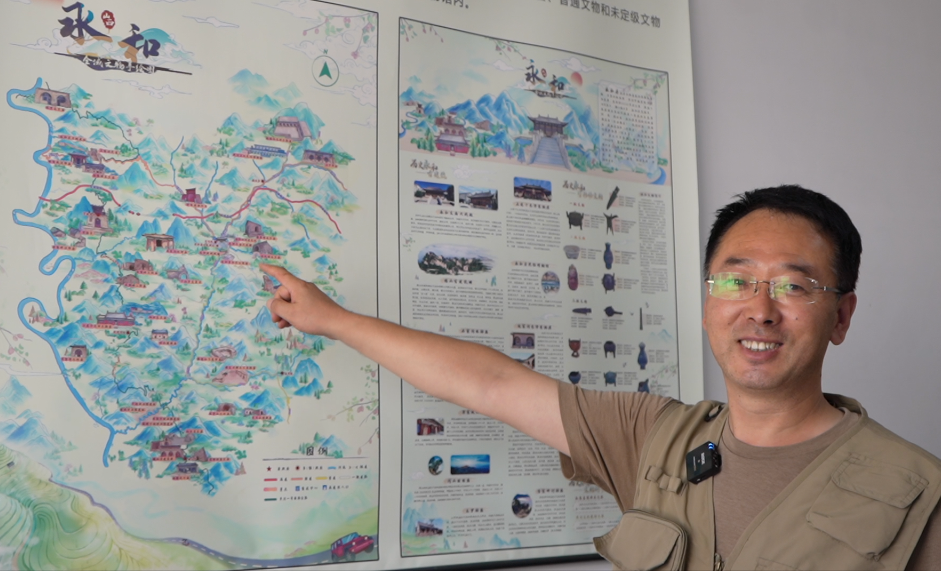 在刘永红的办公桌后,挂着一张文物地图海报,这是他专找设计师设计的,如他所说这是他的行军打仗图,也是文保宣传图。刘永红还兴奋地向我们展示了他常用的两款软件,他说坐在这里就能看到全县每一处文物,这样放心。干文物工作27年,对于学习新技能,他孜孜不倦、乐此不疲,他说“我们县文保工作数量多,难度大,这些软件能提高工作效率,并且咱们学会这些,以后不用求别人了”。