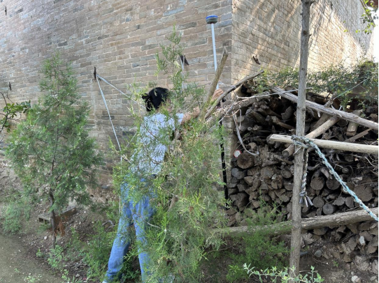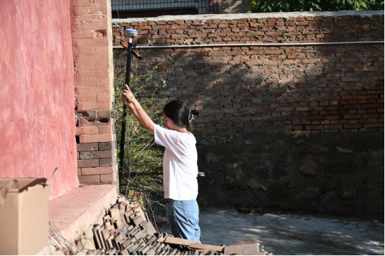 这样类似的情况还有很多,例如在小李三郎庙正殿的西南角堆放有两米左右高的柴火,导致RTK打点困难,姚队长一声“上去测!”便打消了我正准备搬走柴火的这种耗时的想法,而在我实际操作的过程中,我发现打点测绘问题并没有我想象中那么困难,由于事先在平地上已经将名称输好,当我手握着RTK设备爬上去后,只需将点对准,确保信号稳定,点击打点按钮,五秒钟过后,提示打点成功的声音响起便完成了测绘工作。