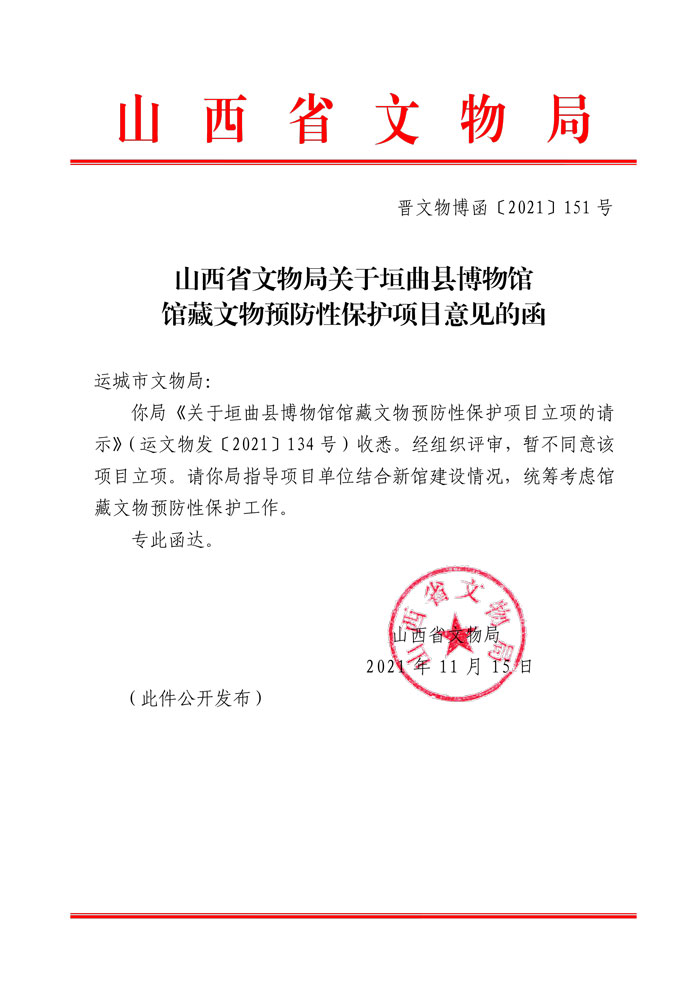上一篇 : 山西省文物局关于原平市博物馆馆藏文物预防性保护项目意见的函