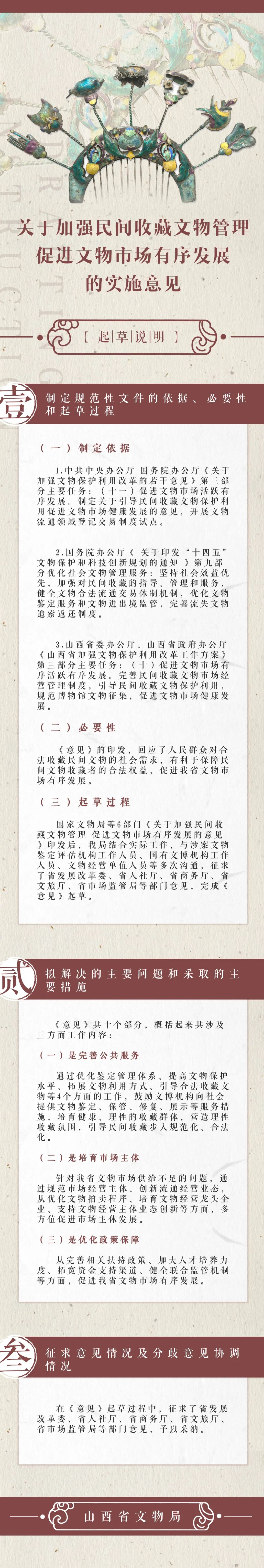 为加强山西省民间收藏文物管理,厚植高质量发展根基,促进文物市场有序发展,近日,山西省文物局等6部门联合发布《关于加强民间收藏文物管理促进文物市场有序发展的实施意见》。