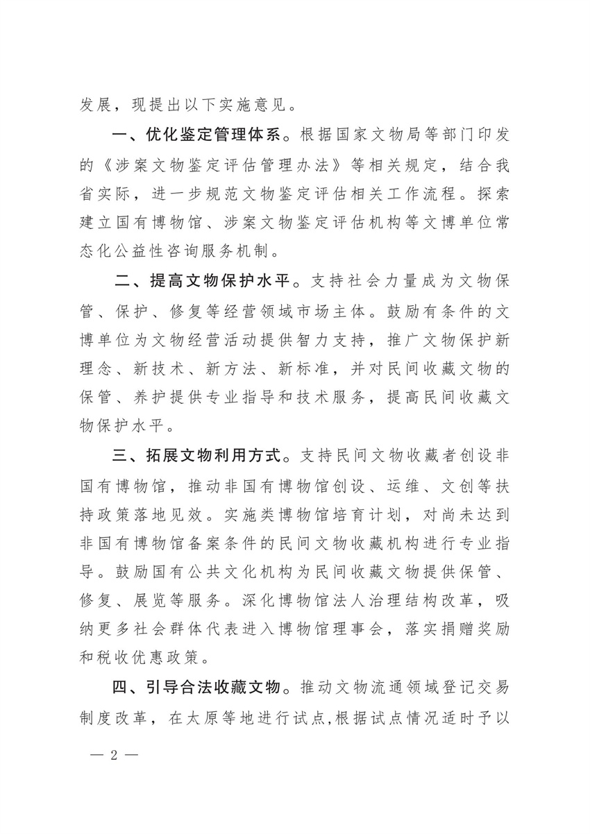 《意见》的印发,回应了人民群众对合法收藏民间文物的社会需求,有利于保障民间文物收藏者的合法权益,促进山西省文物市场有序发展。