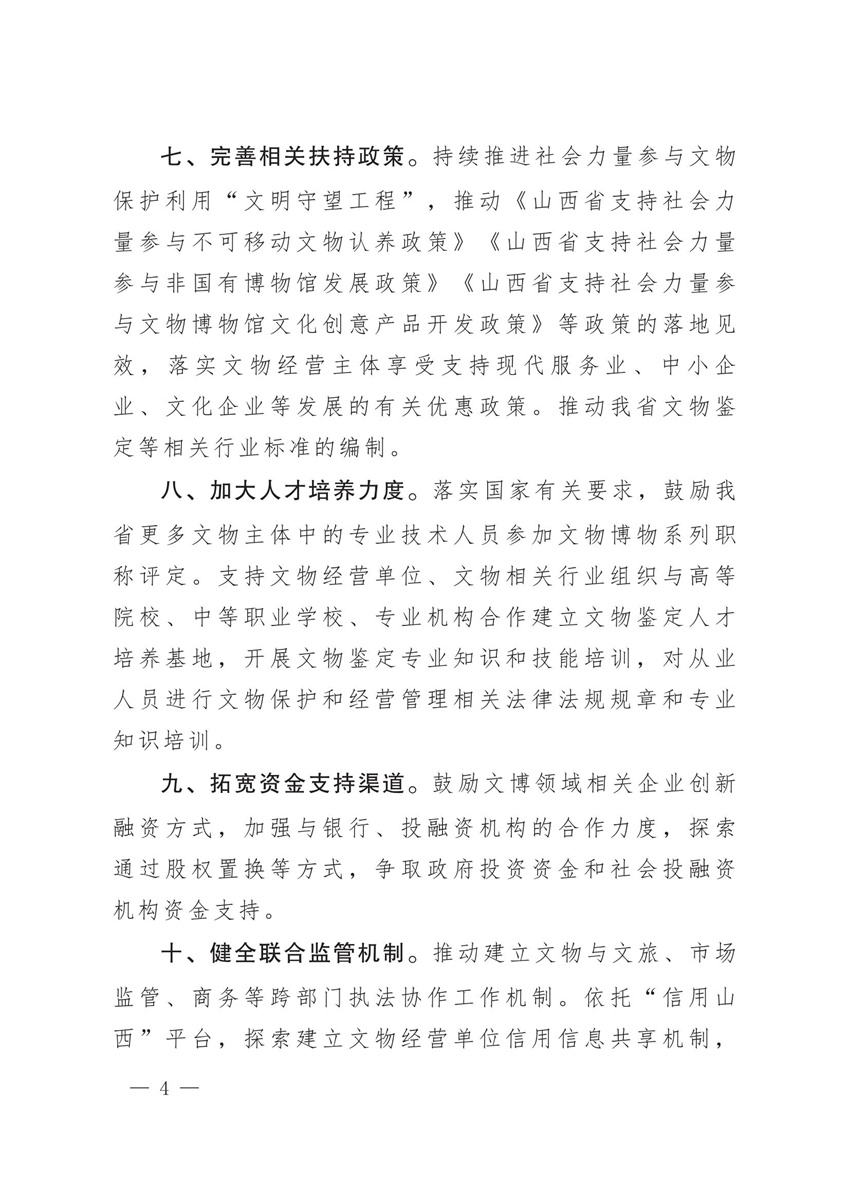 七、完善相关扶持政策。 持续推进社会力量参与文物保护利用"文明守望工程",推动《山西省支持社会力量参与不可移动文物认养政策》《山西省支持社会力量参与非国有博物馆发展政策》《山西省支持社会力量参与文物博物馆文化创意产品开发政策》等政策的落地见效,落实文物经营主体享受支持现代服务业、中小企业、文化企业等发展的有关优惠政策。推动我省文物鉴定等相关行业标准的编制。