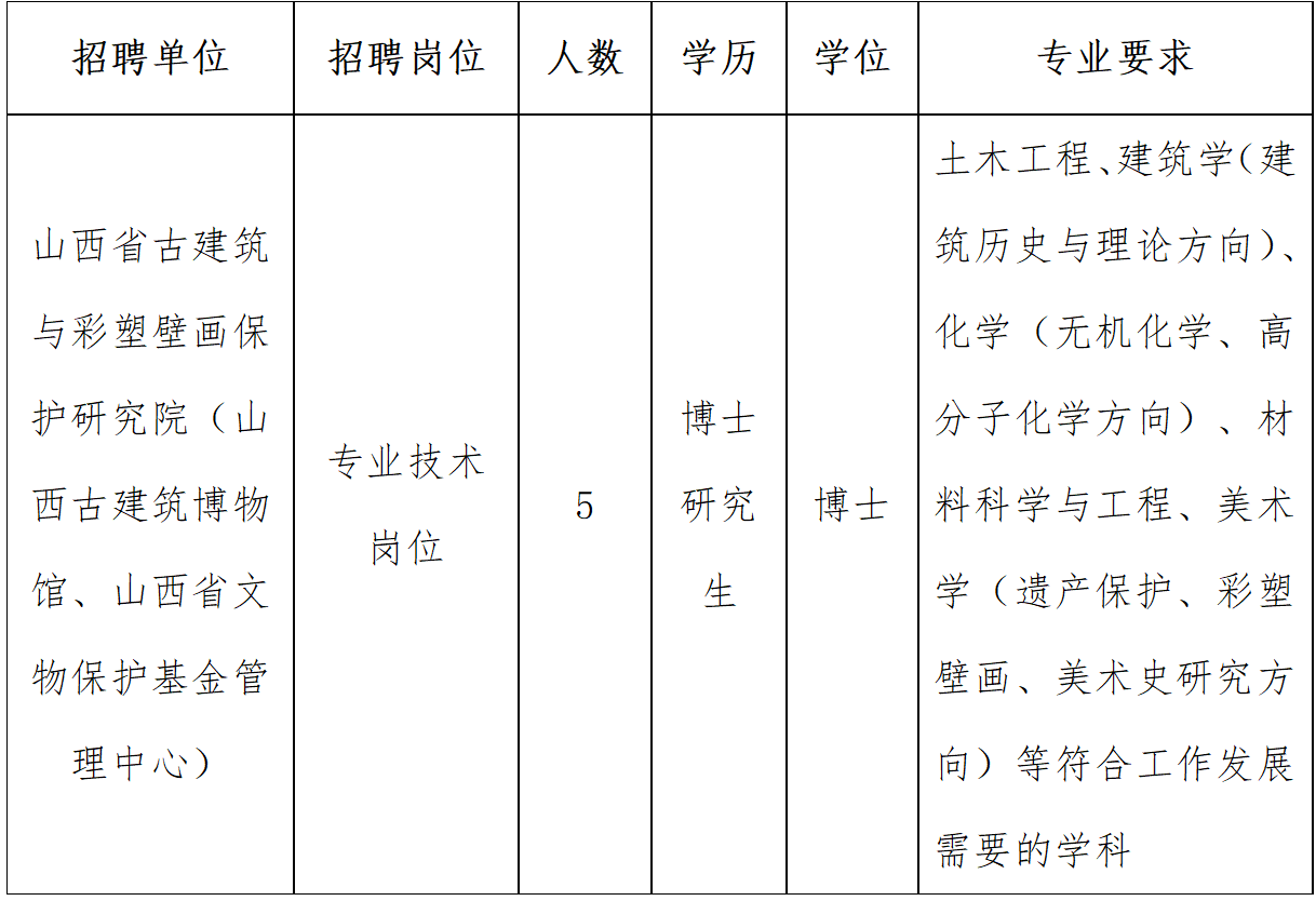山西省古建筑与彩塑壁画保护研究院(山西古建筑博物馆、山西省文物保护基金管理中心)2025年公开招聘博士研究生5名,均为专业技术岗位。招聘岗位所需的具体条件见下表: