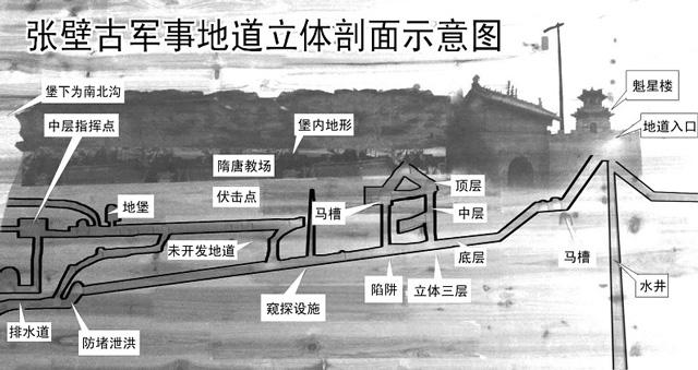 海拔1020米,三面临沟,一面平川,位于介休市龙凤镇张壁村的张壁古堡就处于这样险要的地理位置。这种险峻地形,本身就有很强的防御作用,而古人还充分利用依山退避、难攻易守的地理优势,在古堡地下又建有长达3000米、上下三层,四通八达,攻防兼备的古地道。