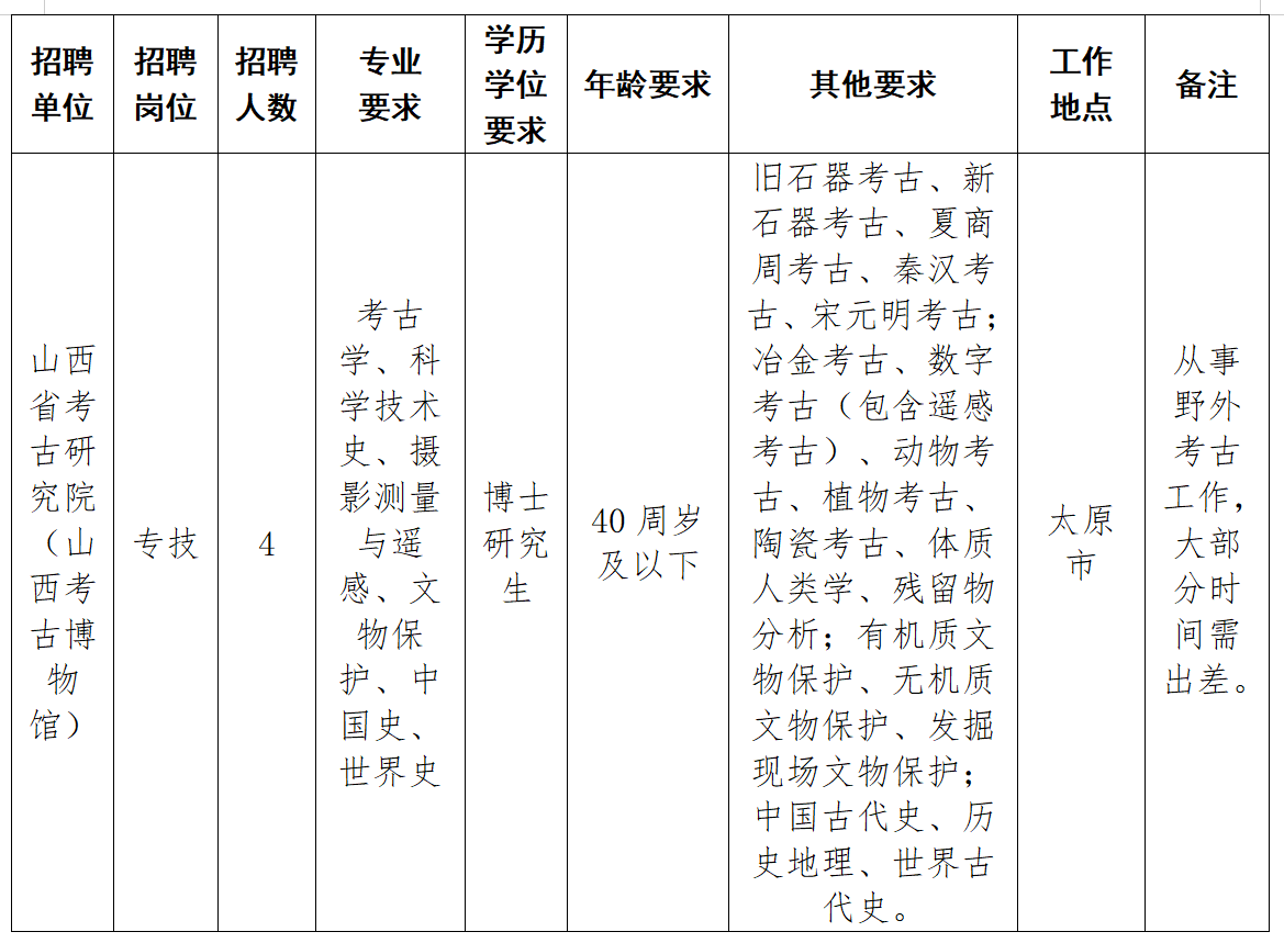 山西省考古研究院(山西考古博物馆)2024年公开招聘博士研究生4名,均为专业技术岗位,招聘岗位所需的具体条件见下表: